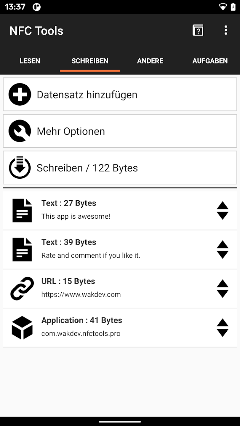 Probiere aber auch gerne andere Apps."NFC21 Tools" z.B. ist eine gute Alternative.