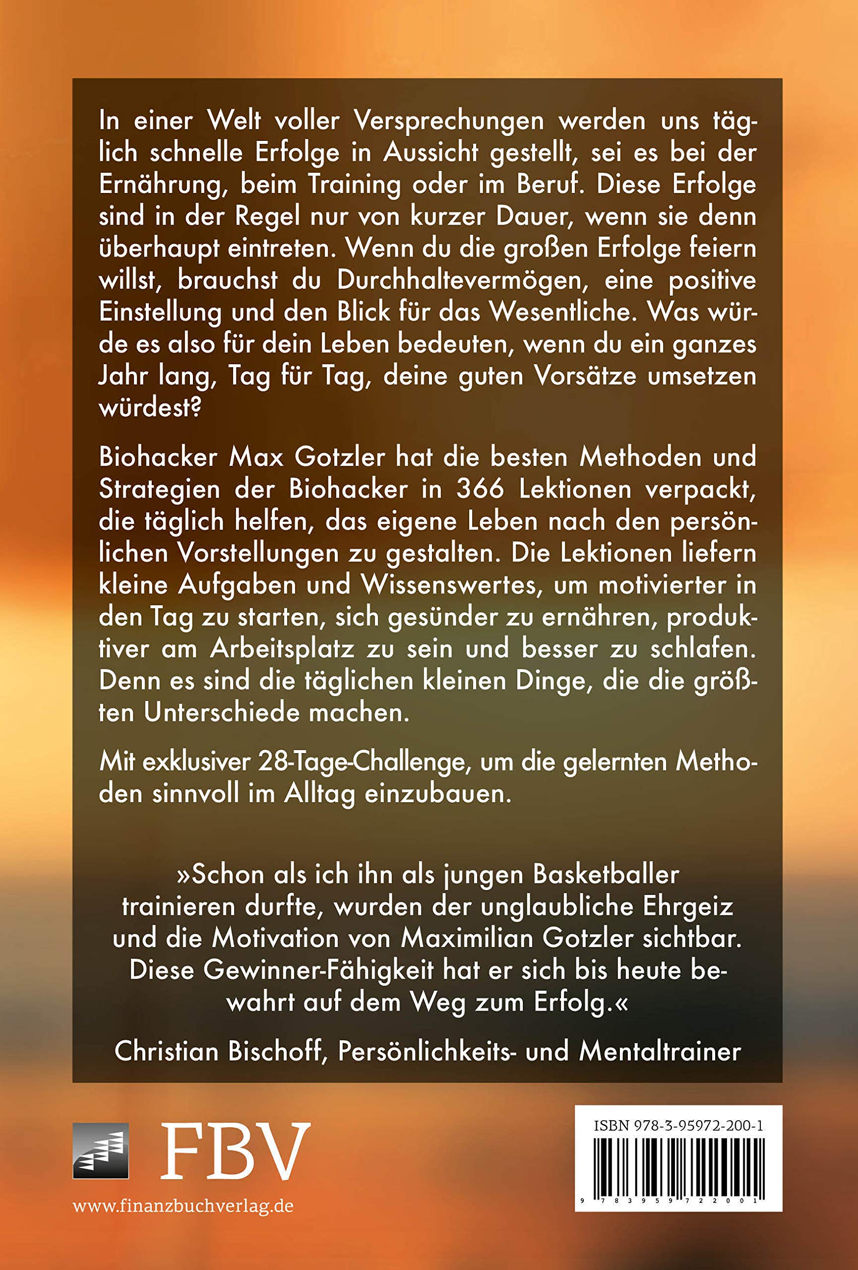 Biohacker Max Gotzler hat die besten Methoden der internationalen Biohacker-Szene in 366 alltagstaugliche Lektionen verpackt – für mehr Fokus, Energie, Schlaf und Flow. Jede Lektion bringt neue Impulse, kleine Aufgaben und inspirierendes Wissen, um deine Vision vom Leben Stück für Stück Realität werden zu lassen.