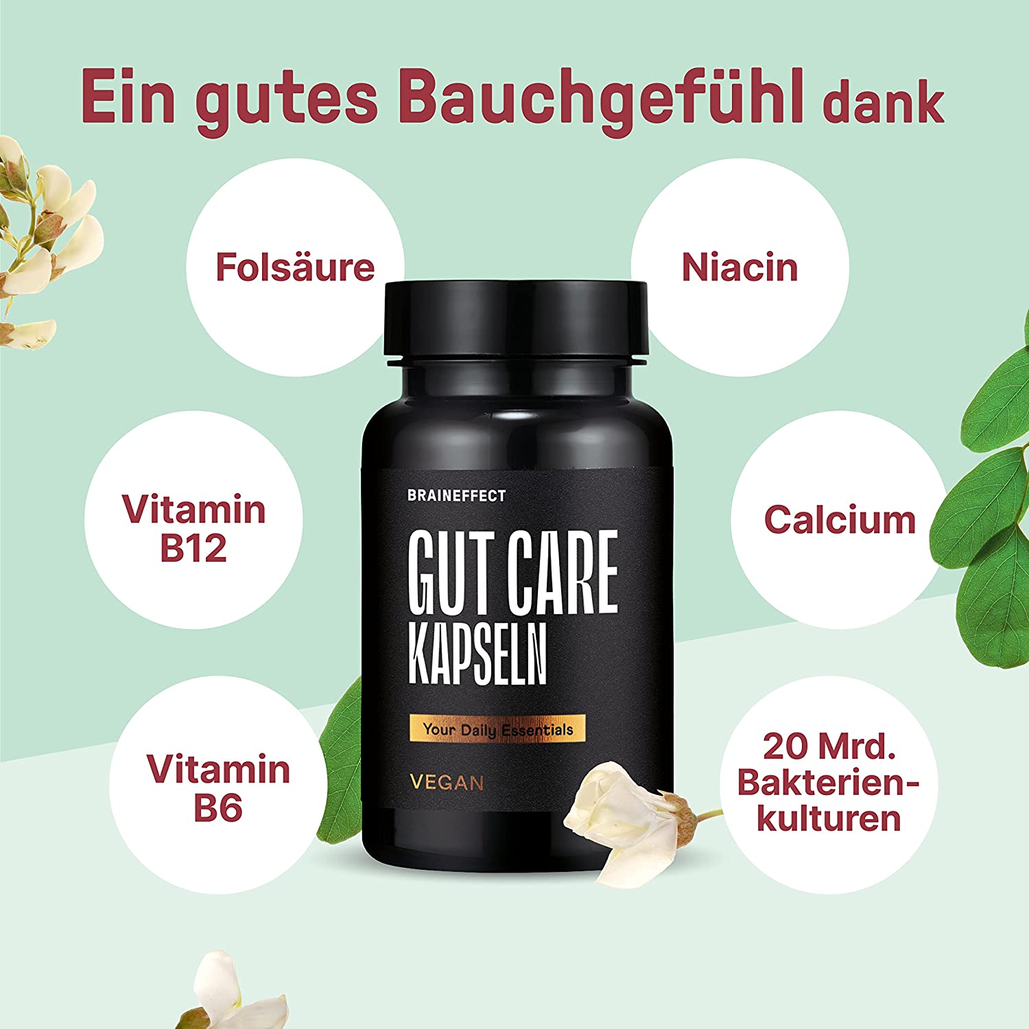 GUT CARE Kapseln enthalten: Calciumcarbonat, Akazienfaserpulver (Acacia seyal), Dextrin (Nutriose), Überzugsmittel: Hydroxypropylmethylcellulose (pflanzliche Kapselhülle), Lactobacillus crispatus, Nicotinamid, Lactobacillus plantarum, Lactobacillus acidophilus, Lactobacillus rhamnosus, Bifidobacterium longum, Bifidobacterium breve, Bifidobacterium bifidum, Bifidobacterium lactis, Lactobacillus casei, Bifidobacterium infantis, Streptococcus thermophilus, Lactobacillus helveticus, Lactococcus lactis, Lactobacillus gasseri, Bifidobacterium adolescentis, Lactobacillus paracasei, Bacillus coagulans, Enterococcus faecium, Lactobacillus reuteri, Lactobacillus salivarius, Vitamin B6, Folsäure, Vitamin B12