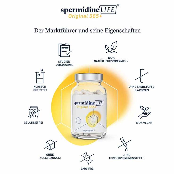 Aufgrund von über zehn Jahren Forschung in Zusammenarbeit mit international anerkannten ZellforscherInnen haben wir spermidineLIFE® Original 365+ entwickelt, welches das erste Nahrungsergänzungsmittel mit einem hohen Spermidingehalt weltweit ist. In Zusammenarbeit mit internationalen Kliniken und Universitäten wurde es daraufhin positiv auf Sicherheit und Verträglichkeit getestet.2