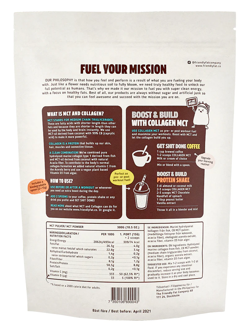 - MCT ist ein richtiggehender Kraftstoff für Training und Erholung, aber vor allem auch für einen gesunden Energiehaushalt den ganzen Tag hindurch. Mit Meereskollagen aus wild gefangenem Fisch mit Vitamin C & D.