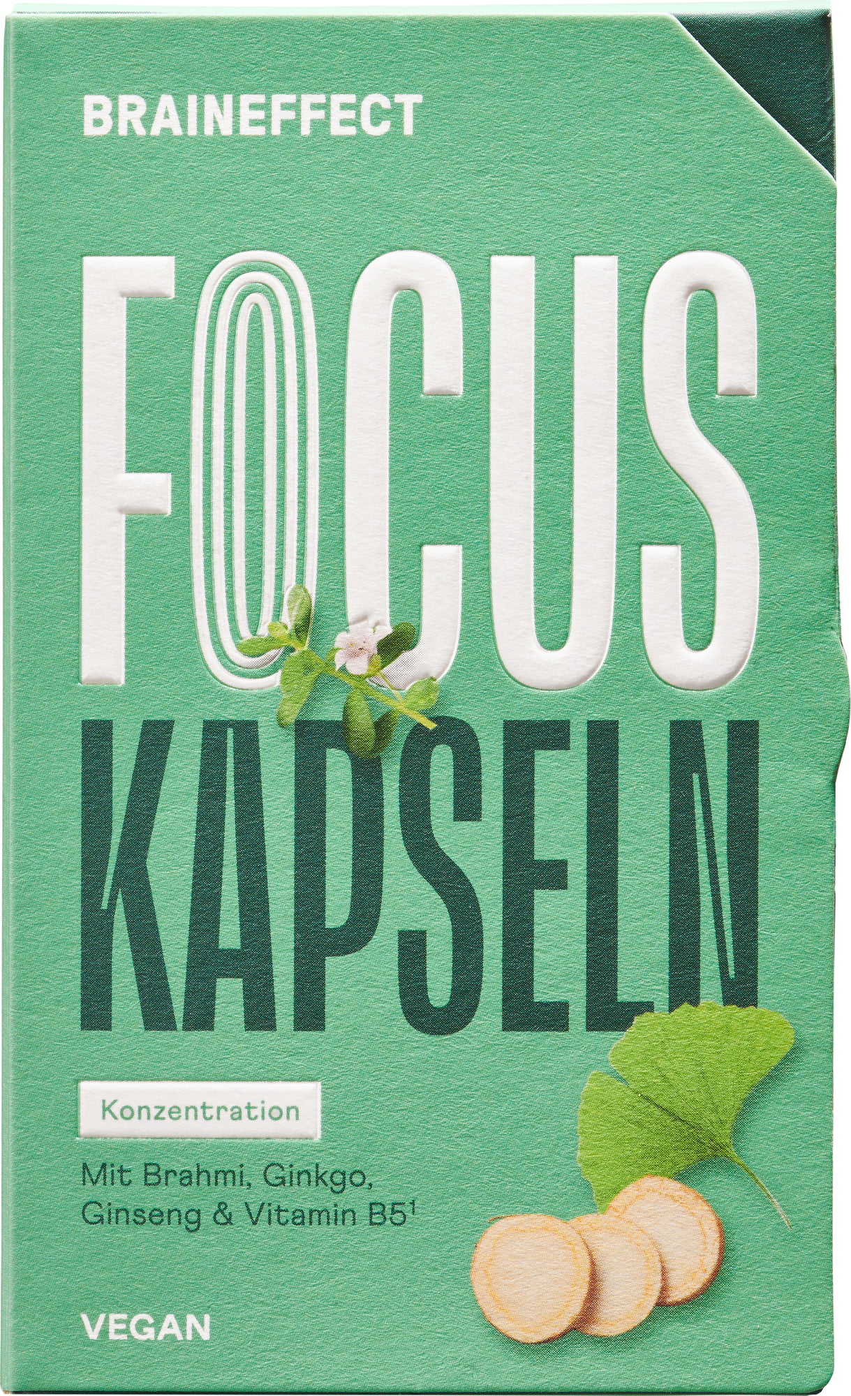 FOCUS KAPSELN enthalten: Brahmi-Extrakt (Bacopa monnieri), Citicolin Cognizin® (CDP-Cholin)2, Acetyl-L-Carnitin, Hydroxypropylmethylcellulose (pflanzliche Kapselhülle), Panax Ginseng-Extrakt (aus Stamm und Wurzel), Zink, Pantothensäure (Vitamin B5), Schwarzer Pfeffer-Extrakt, Vitamin B12.
